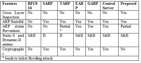 Table 1 compares the proposed algorithm with existing techniques RFC 826 [33], SARP [34], TARP [35], EARP [36] and Central Server Approach [37]. Though the proposed system performs cross-layer checking, non-cryptographic still it incurs some of the attacks caused through IP
