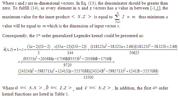 Here, we are suggesting a general method of conveying the kernel function to resolve the vagueness on how to apply Legendre kernels. As of what we know, there was a preceding work illustrating the Legendre polynomials for vector inputs recursively. thus for vector inputs, we illustrate the generalized Legendre polynomials as: