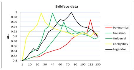 The classification experimentations are carried out on number image segmentation data sets like Brickface, Foliage, Sky, Cement, Window, Path and Grass data set [30-31]. The data has 7 diverse image classes. It has 210 data for training and a different 2100 data for evaluating. Every vector has 18 elements having diverse maximum and minimum values. For the training, we got 30 data for the class (+1) and 180 data for the class (1) and likely for testing, we have 300 against 1800 data, correspondingly for every class. With the test step, the kernel functions presented various performance values on various classes and there was winning kernel presenting the optimal performance one very class as shown in Table (3). The suggested Legendre kernel operated better than the standard. The optimal performance values having the least SV numbers are presented in bold. Table (3) illustrates the test results for every class with various kernel functions. We carry out some evaluations to compare the suggested kernel with its preceding opposite as well as the Gaussian (GF) [25], polynomial (POLY) [14], Wavelet [7] and Chebyshev [22] kernel functions. The operation of the suggested kernel with SVMs according to classification accuracy (ACC) and kernel parameter against SV, is calculated by implementation to data sets in Table (3). As shown in Table (3), the generalized Legendre kernel results present better generalization capability than the current GF, POLY, Wavelet and Chebyshev kernels. For instance, the optimal ACC is retrieved for Brickface, Foliage, Window, Path, Grass with the least SV to be 17, 6, 4, 6 and 15 correspondingly. Even though the ACC of the generalized Legendre kernel and GF kernel for Foliage data is similar, we emphasize that SV of the generalized Legendre kernel has the least. In Figs.(1-7), we give the ACC against SV of the POLY, GF, Wavelet, Chebyshev, and generalized Legendre kernels for Brickface, Foliage, Sky, Cement, Window, Path and Grass data set. The generalized Legendre kernel functions present the minimal SV 4 while maintaining the generalization ability right for the dataset. The relation between ACC and SV showed that, as the SV increases, the ACC increases and asymptotically arrive at a high performance value.