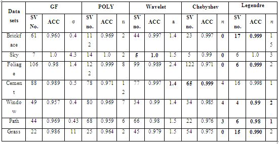 Figs. (8-12) describe the relation between kernel parameter vs. SV for GF, POLY, Wavelet and Chebyshev kernel functions when these methods are implemented on Brickface, Foliage, Sky, Cement, Window, Path and Grass data set correspondingly. These figures prove that as the kernel parameter increases, the Chebyshev, Legendre and wavelet kernel increase their operation and asymptotically reach allow performance value. While as the kernel parameter increases, the Chebyshev and wavelet kernels need more SV than Legendre kernel. During the evaluations, we witnessed that the generalized Legendre kernel function reaches the minimal SV number in general.