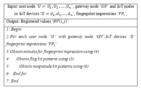 From equation (4), the minutia features ‘ M’ are obtained for each user ‘Ui ’ both using the location information ‘(P,Q)’ and direction ‘Q’ information respectively. In this work, user registration for the biometric fingerprint is performed using Neighborhood Binary Pattern Registration (NBPR) model. Each neighborhood pixel for the corresponding location information is represented as a binary pattern and is denoted by two bits. In binary patterns, the two bits is Most Significant Bit to represent the flag symbol and Least Significant Bit to represent the magnitude. The pseudo-code representation of the Neighborhood Binary Pattern Registration (NBPR) is given below.
