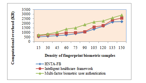 From the above equation (13), the computational overhead ‘CO ’ is obtained using the density of human biometric samples ‘Usize’ and memory consumed for gradient extraction ‘G[i,j]’, gradient direction ‘ q(i,j) ’ and normalization ‘L1 norm’. It is measured in terms of KiloBytes (KB). For all scenarios as shown in the figure, the computational overhead is increasing with fingerprint biometric samples considered from different users. Ten unique experiments were conducted for each review size. The sample calculation is provided below. Followed by the calculations measured for computational overhead using the proposed HNTA-FB method, Intelligent healthcare framework and Multi-factor biometric user authentication graphical representation are provided .