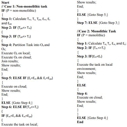 6. In the case of non-monolithic tasks, calculate Tm, Tc, Tpa, Em, Ec and Epa. The partitioning decision in the form of Oa = {O1, O2,…,Ok) executes on local environment and Ob = {Ok+1, Ok+2, …… On), executes on the remote environment. The partitioning algorithm balance the problem to both the environments to achieve the simultaneous