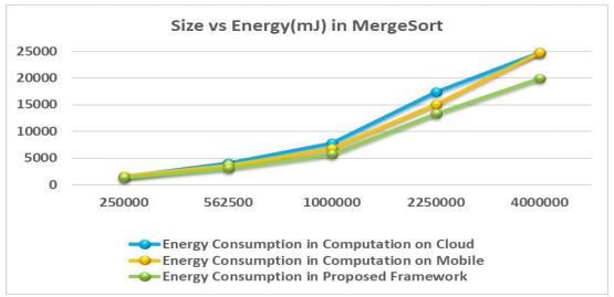optimization of energy consumption. For real-time applications, execution time plays an important role to evaluate the performance. Hence, the energy efficiency and performance of the work has evaluated by comparing results at different experimental phases. To validate the energy efficiency, different sizes of data files are used. Execution time and energy are measured for all phases for mobile, cloud and for proposed framework. Initial measure has performed for merge sort. Results shows that offloading is useful to reduce the execution time, energy consumption and boost up the computation.