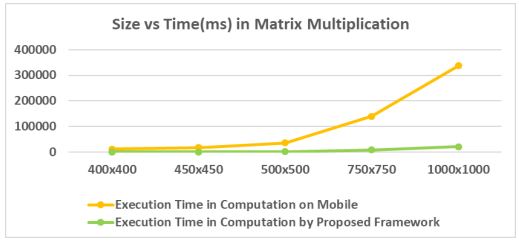 A proposed framework gives instant benefit for the computation on small sizes also as the matrix multiplication is the problem of higher complexity O(n3 ). When time is considered for a very large matrix, there is a benefit at around 94%. In case of size vs time graph, the time increases exponentially with the increased data size as the complexity of execution dictates the energy consumption. As figure 12 shown, for a matrix of size 250×250, the reduction in execution time is around 13%. As the matrix size grows to 350×350, there is a significant advantage and for a matrix of 750×750 and beyond, the advantage is around 94% which shows the significant achievement.