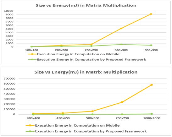 As can be seen, the advantage that is obtained in energy by offloading the matrix to a cloud is small in case of small matrices 100×100. As the size grows, the advantage increases even more. For the matrix of size 250×250, the reduction in execution energy is around 67.5%. But as the matrix size grows to 350×350, there is a significant advantage and for a matrix of 750×750 and beyond, the advantage is around 98% which shows the higher efficiency.