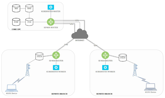 With SD-WAN being the natural extension of SDN and Kubernetes becoming the de-facto container orchestrator, the possible use cases for an Edge Computing case are high in number. In the proposed use case, a Kubernetes master node will be deployed in a company’s Central Office (CO) alongside the suggested orchestrator that will be aware of the changes happening in the Kubernetes cluster and will react accordingly. The development of this orchestrator will enable the possibility of deploying container workloads on remote branch locations and, at the same time, facilitating access towards its services by properly discovering the nodes containing them. In Figure 1, the proposed topology including the high-level required 5G network for allowing the implementation of local breakout is depicted.