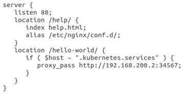 On the other hand, a normal Kubernetes Nginx service running in the cluster would have been limited to internal requests due to the lack of an “external-ip” not being granted to bare metal Kubernetes load-balancers, and which only work with Kubernetes implementations running on IaaS such as GCP, AWS, or Azure. MetalLB [8] is the load balancer-implementation selected for supporting the reverse proxy service and enables a layer 2 load-balancing through the creation of a controller and speaker deployments on every node it is running. Nginx entities are deployed one per worker node on top of MetalLB, receiving the worker’s node IP address as their external-ip, enabling a reverse proxy behavior for requests coming from outside hosts towards port 80 and creating a corresponding Nginx pod. The need for the NodePort on the end user’s side has been avoided. Instead of this, the “location” command in Nginx is being used to redirect users to the right HTTP service based on service’s name. As an example, let us consider the Nginx configuration file for a worker node called worker1 that is running a service called “hello-world” and a worker node called worker2 running a service called “my-app”. From the view of worker1, a host close to worker1 will use the entry <vtt.kubernetes.services> for accessing services located in worker1, and an entry in the form <worker2.kubernetes.services> for all the other remote nodes, in this case a node called worker2. For avoiding the usage of NodePort corresponding to “hello-world” service, this Nginx configuration file will enable the adding of “/hello-world/” to the requested URL for accessing this service, via the location command. For a host whose closest node is worker1, the request’s URL is now in the form “vtt.kubernetes.services/hello-world/” when accessing this service located in worker1, for accessing the service “my-app” in worker2, the request’s URL would be “worker2.kubernetes.services/my-app/”. Figure 4 shows the example Nginx configuration file for worker1.