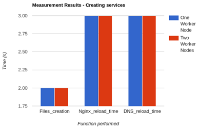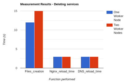 It must be taken into account that reloading the required services in the orchestrator are carried out almost simultaneously; thus, the time for a service to be available for the end-user, as shown in Figure 7, is the time required to reload the DNS and Nginx (~5 seconds). We can infer that at the moment of creating a service, the number of worker nodes available does not influence the overall time. One reason for this might be the fact that Docker containers backing those services are created only in the scheduled worker nodes, therefore eliminating any possible queuing time. Of course, times regarding the download of images required to run certain services are not taken into account. On the other hand, in Figure 8 we can note a slight difference in the files creation function when two worker nodes are present. The reason behind this behavior might be the fact that Kubernetes master node also must delete the corresponding API object for every deleted service.