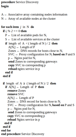 As explained in the previous sections, the zone files used in the external DNS service as well as the Nginx configuration files cannot be static. A master node service discovery is therefore necessary for the continuous update of all zone files in the gateways running the external DNS service, as well as for the service location updates in the Nginx pod running in every worker node. The service discovery works based on the principle that deployment and services’ containers are not created at the master node, but at worker nodes. Kubernetes does not provide a default way of associating a certain service with the scheduled worker node, therefore, knowing the pods running on a determined worker node alongside the list of all available services in the cluster provides a way to start a service-node matching. Before performing the matching, the pods output must be filtered in order to avoid cluster management related pods to be counted as services, pods such as calico, Nginx or the MetalLB’s controller and speaker must not be included. The discovery starts when all the available worker nodes and their corresponding IP addresses are obtained as an array using the Kubernetes API. The node array structure corresponds to a node’s name followed by its IP address; therefore, worker’s node names will always be located in an even index within the array, with their respective IP addresses located at the subsequent, odd position. Next, for every node in existence, we obtain the running pods and all the available services in the whole cluster.