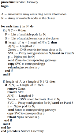 During the subsequent iterations, the number of the obtained pods per worker node is compared against the values previously saved in the associative array, if there is a change in one of the values, then the discovery service can identify if a service might have been added, moved or deleted. After this, it deletes the current worker node’s zones file and Nginx configuration to create new files with updated information. The Nginx service corresponding to the worker node where a change occurred is reloaded and the zone files are sent to the respective routers, these actions only occur in the nodes where a service was added or deleted leaving the unchanged nodes working continuously without any disruption. The service discovery was conceived in a way that no extra efforts such as copying master’s certificates or installing extra software is necessary for a given worker node when joining the cluster, only the compulsory kubeadm, kubectl, kubelet and Docker are required. Being written in Bash script language, portability is assured as no modifications are required for running it in any Unix-like operating system. It is worth noting that due to actions being taken only in the worker nodes where a change has occurred, sending the DNS zones files will happen only once per change, a detail that helps in reducing the bandwidth use due to the lack of continuous advertisement. Another reason behind this behavior is the fact that the content of a zone file are mere URLs and their corresponding IP addresses, which are not prone to change, and if they do, this does not happen quite often. In Figure 5, a high-level version of the discovery algorithm used for the master service discovery is shown.