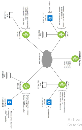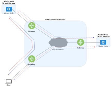 First, we have the SD-WAN network simulation virtual machine. This entity contains the OpenFlow speaking SDN controller as well as all the Mininet simulated gateways and hosts, providing an underlying physical network. Gateways are connected through a set of Open vSwitch virtual switches that emulate the Internet; the protocol used for the communication between these gateways is BGP, which was implemented by using Quagga [3]. Each of the gateways represents a corporation’s branch office, which is perfectly capable of hosting a Kubernetes master or worker node and the services deployed on them. The SDN controller runs on ONOS [4], for this thesis the version of ONOS used is 14. ONOS controller is deployed by using Docker alongside ATOMIX for supporting the creation of extra ONOS instances, effectively forming a cluster. [5]. ONOS is a controller written in Java and offers high modularity in the form of a wide variety of applications that can be activated depending on the developer’s needs [4].
