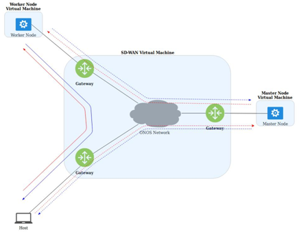 Next, we have the Kubernetes master node virtual machine. The master node is connected to one of the gateways through a Linux bridge created for this solely purpose; the virtual interface located on the SD-WAN virtual machine is loaded to Mininet, therefore simulating a direct connection. To successfully deploy the master node, kubeadm, kubelet and kubectl alongside Docker must be installed in the virtual machine. The master node is not a single entity, it is the result of a combination of a group of pods, each of them having a specific function. Each of the pods that conform the master will have one or more containers that are created using Docker, among them, the Container Network Interface (cni). The cni will provide an IP address to every single one of the created pods and is also in charge of the whole networking for the pod network, including the internal DNS service. Once the master node is ready, the gateway to which it is attached will serve as a gateway for both, a host machine and the master node. Host machines connect remotely to the master and create pods, deployments or expose services, although this is not straightforward. The security certificates must be copied to the host machine first, among the copied files there is the configuration archive containing the master’s IP address and port number, allowing kubectl command to know the right destination of its queries. Due to security reasons, the master node will not be scheduled any pod and only a limited, selected number of hosts are able to access the cluster to deploy or delete services.