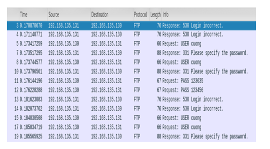 To test this case we use an FTP client to log in to the FTP server with a few failures before it succeeds and use ping to check the situation where the application repeats the session with the FTP server. As a result, both cases have no warning of attacks. As shown in Figure 5.