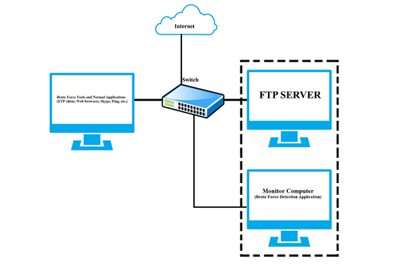 The application was developed using the Perl programming language and tested on our enterprise network, in principle, the network system is equivalent to the network described in Figure 4. The attack detection application running on a monitoring computer is located on the enterprise network partition so that it can catch the incoming and outgoing FTP server traffic. We experimented with continuous capture and processing of 1000 packets, with the clustering parameters Eps = 20 and MinPts = 10. Experiments were conducted in turn with the current popular attack tools including Hashcat, Brutus, Hydra, Patator, Medusa, and Ncrack. Other common applications are also run simultaneously to create a variety of traffic on the network.