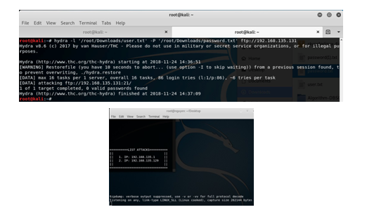 When using THC Hydra runs from two different machines to attack the FTP server, and also pings to the FTP server and runs various types of applications on other computers. The monitoring machine results show the IP addresses of the attacking machines as shown in Figure 7.