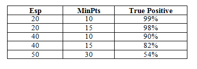 To evaluate the accuracy of the application, we conducted a test data set. This data set is based on collecting packet traffic from short-term automated attacks that are repeated many times randomly by four computers on the network over a 10 hours period. Tested on the data set with the change of clustering parameters, we tried many different Esp and MinPts parameter pairs. Based on understanding the data in the application we selected the Esp values in the range [10-80] and MinPts in the range [5-40] for testing. Some typical results are presented in Table 1.
