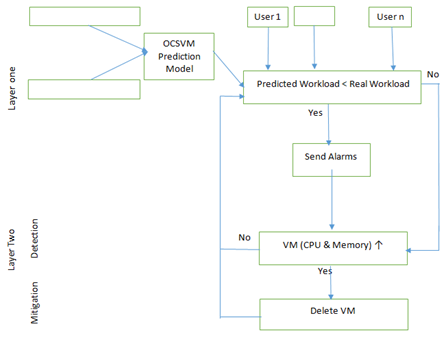 Figure 1 explains the MDL architecture. At the first stage, the prediction model receives the input parameters which are data and time of previous workload and the size of the requested workload. The comparison between real workload requested by users and the predicted workload determines that if the alarms will send to cloud management or not. At the second stage, the detection and mitigation will run. In the case of the resources utilization of VM is in an increasing manner. The mitigation process will run by detecting the VM has an increasing manner.