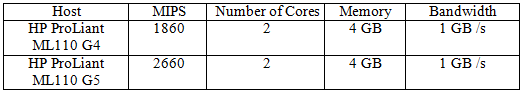 For hardware, the experiments were test cross a data center that has 800 heterogeneous physical nodes. A data center environment is heterogeneous where has of two types of hosts; the first half of the hosts are HP ProLiant ML110 G4 servers with 1,860 MIPS per core, and the other half are HP ProLiant ML110 G5 servers with 2,660 MIPS per core. Each server has 2 cores, 4 GB of memory and 1 GB/s of network bandwidth. The power consumption of active 2 servers in the simulation is derived from the corresponding figures in the Standard Performance Evaluation Corporation (SPEC) [36]. Table 1 summarizes a data center configuration