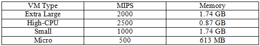 According to the result of the workload clustering, the best number of clusters is 4. So, four different virtual machines are used following Amazon EC2 instances [37]: High-CPU Instance (2500 MIPS, 0.87 GB), Extra Large Instance (2000 MIPS, 1.74 GB), Small Instance (1000 MIPS, 1.74 GB), and Micro Instance (500 MIPS, 613 MB). At beginning the simulation, VMs are hosted according to the resource needsthat is defined by the VMs. Table 2 summarizes virtual machines configurations.