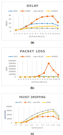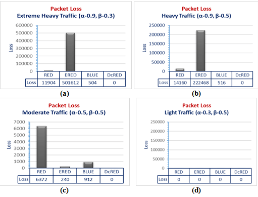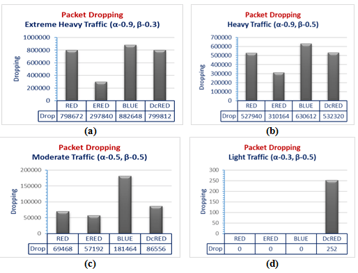 In Figure 6(a) with extremely heavy traffic, ERED decreases dropping, BLUE increases dropping DcRED maintain the same dropping as RED. Accordingly, DcRED over-performs all other methods by maintaining the dropping rate while reducing delay and loss significantly in extremely heavy traffic. BLUE has the worst dropping rate and the best delay and loss in extremely heavy traffic. ERED have the worst delay and loss and the best dropping rate in extremely heavy traffic. In Figure 6(b) and Figure 6(c) with heavy and moderate traffic classes, similar results obtained from the compared methods. As such, ERED drops the least number of packets, RED and DcRED drop more packets compared to RED, while BLUE drops significantly more packets compared to all other methods. Accordingly, DcRED over-performs all other methods by maintaining the dropping rate while reducing delay and loss significantly in heavy and moderate traffic classes. BLUE has the worst dropping rate and the best delay and loss in the moderate traffic class. ERED have the worst delay and loss and the best dropping rate in the moderate traffic class. In Figure 6(c), all methods almost drop zero packets, except for DcRED, which dropped an insignificant number of packets.