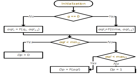 The parameters and variables are initialized in line 1 and line 2. The value of aql is calculated as given in line 4 and line 5. Then, the value of the delay parameter is calculated in line 6. The Dp calculation is implemented based on three scenarios, as given in line 7 to line 12. As similar to RED, the aql, which is considered as the queue monitoring parameter is compared to two thresholds, as given in line 7 and line 11:when aql value is within the two thresholds, Dp is calculated as given in line 8 and line 9, with reference to the values of the delay, a counter parameter that avoids global synchronization, the maximum probability parameter, and the two thresholds. Accordingly, the arriving packet A is dropped based on the calculated value in line 10. In line 11, if aql is greater than the maximum threshold, then the packet is dropped firmly. Finally, in line 12, if aql is less than the minimum threshold, then the packet is accommodated. Line 13 and line 15 trace the empty buffer and save the time value that is used to calculate the aql.