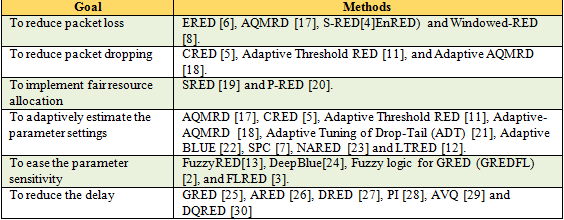 The following AQM methods extend RED to achieve different objectives. Particularly, to reduce packet loss, Effective Random Early Detection (ERED) [6], Adaptive Queue Random Early Detection (AQMRD) [17], Research on Improving Random Early Detection (S-RED) [4], Enhanced RED (EnRED) and Time-window Augmented RED (Windowed-RED) [8]were proposed. Similarly, various methods were proposed to reduce packet droppings, such as Cloud-based Random Early Detection (CRED) [5], Adaptive Threshold RED [11], and Adaptive AQMRD [18]. For a fair resource allocation objective, which implemented by dropping packets based on the shared bandwidth consumed by each flow, Stabilized RED (SRED) [19] and Probability-based RED (P-RED) [20] methods were proposed. Various methods were proposed for adaptive parameterestimation, such as: AQMRD [17], CRED [5], Adaptive Threshold RED [11], Adaptive- AQMRD [18], Adaptive Tuning of Drop-Tail (ADT) [21], Adaptive BLUE [22], Self-Tuning Price-based Congestion Control (SPC) [7], New Adaptive RED (NARED) [23] and Queue-Threshold RED (LTRED) [12]. To ease the parameter sensitivity, various AQM methods used fuzzy logic with queue management. Examples of fuzzy-based AQM are FuzzyRED[13], DeepBlue[24], Fuzzy logic for GRED (GREDFL) [2], and FLRED [3]. To reduce the delay, various AQM methods were proposed, these are Gentle RED (GRED) [25], Adaptive RED (ARED) [26], Dynamic RED (DRED) [27], PI [28], AVQ [29] and DQRED [30]. Table 1 summarizes the objectives of the existing AQM methods.