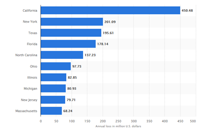 [42] IC3. (July 1, 2019). Loss through cybercrime in the United States in 2018, by victim state (in million U.S. dollars) [Graph]. In Statista. Retrieved September 19, 2019, from https://www-statista-com.portal.lib.fit.edu/statistics/234993/us-states-with-the-largest-losses-through-cybercrime/