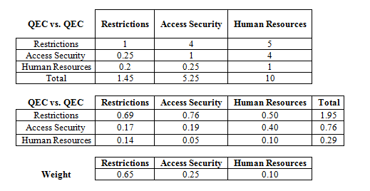 The QEC vs. QEC pairwise comparison matrix is a n x n matrix where each location aij represents how much more important the QEC (i.e., restrictions, access security, and human resources) at row i is than the QEC at column j. The importance of each QEC is configured based on management’s goals and objectives. The format of the QEC vs. QEC matrix is presented in (4), where wi is the weight given to QEC i.