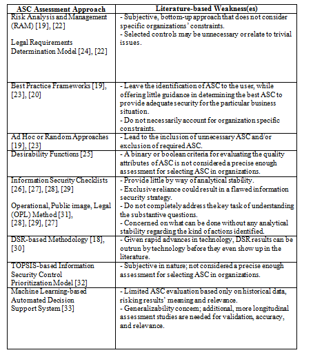 Table 1 summarizes the differences and weaknesses from the above approaches and methodologies used in organizations to assess ASC. As seen, it is a critical task for organizations to select the most appropriate security control or ASC in order to safeguard their information. As a result, new methods to select ASC must be developed that are not only effective and efficient, but also consider constraints and restrictions that are unique to the organization.