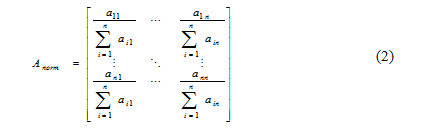 where aij represents the ath element at row i and column j of the respective ASC vs. ASC comparison matrix. Once in normalized form, the weight vector associated with Anorm is computed with (3).