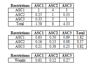 Table 3. ASC vs. ASC comparison matrix, normalized matrix, and weight vector for QEC Restrictions..