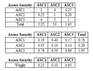 Table 4. ASC vs. ASC comparison matrix, normalized matrix, and weight vector for QEC Access Security.