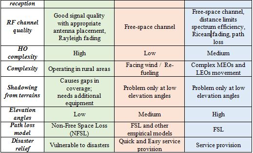 In terrestrials and aerial platforms, handover and interferences management are quite complex due to small cell technology, and multi-tier networks, which aim to increase multiple spot beams over a coverage area to sustain frequency reuse. On the other hand, handover in satellites is existed in MEOs and LEOs due to the movements, but less complex than other systems due to beam forming large cells.