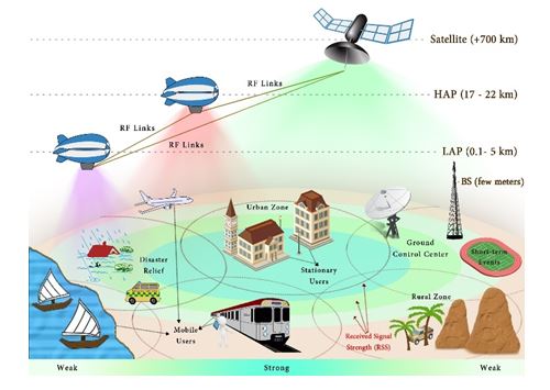 The Aerial wireless communication system includes both LAPs and HAPs. In 1997 HAP technology was recognized as stratospheric layer repeaters, according to the WRC No. S1.66A, placed at an altitude ranging from 17 to 50 km above the ground. Such platforms are of flexible size since they are usually helium-filled and solar-powered airships and can be used for various applications and services such as telecommunications, broadcasting, environmental measurements, surveillance, emergency services, localization and navigation, and e-services. The ITU has described HAPs as “representing a new and long-anticipated technology that can revolution of the telecommunication industry”. Further, a HAP’s position in the sky could take advantage of the strengths of terrestrial and satellite communication systems, whilst avoiding some of their weaknesses. Depending on the minimum elevation angle, HAPs offer coverage of a wide service area of around 400 km with a semi-permanent, high data rate and high capacity-density communications services. HAPs are increasingly seen as an innovative solution to the last-mile problem [39-43].