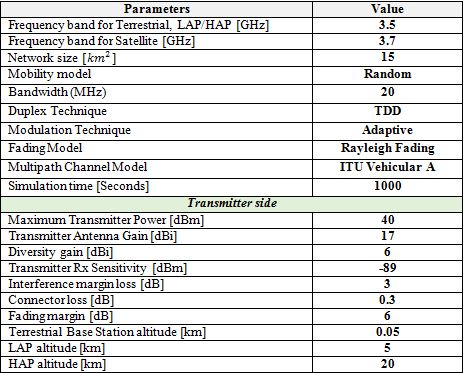Designing an efficient network and check its performance is a critical task, thus it is rational to consider a simulator. For this network, Optimized Network Engineering Tool (OPNET) Modeller is considered which can provide different levels of modelling depending on the necessities and requirements of simulation. The proposed model aims to develop several network scenarios to assess and analyse thenetwork performance of terrestrial, LAP, HAP, and satellites, respectively, with their communication WiMAX payload. Fig.3 shows the OPNET simulator of WiMAX network diagram with 10000 mobile nodes. Based on the above discussion and comparison, the selected wireless communication systems will be evaluated with respect to parameters includes:End-to-end delay, jitter, Mean Opinion Score (MOS), and Throughput. Evaluating these parameters can help in Ad hoc network planning, and assessing QoS requirements using free-space propagation model for all architecture Systems (terrestrial, LAP, HAP, and Satellite). TABLE 5 shows the simulation parameters that relate to antenna specifications, as well as OPNET simulator parameters.