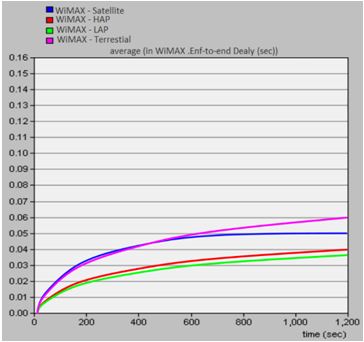 In this subsection, VoIP over mobile WiMAX network is analysed and discussed. Several simulation runs have been performed for each wireless system to measure delay, jitter, MOS, and throughput using the OPNET Modeller simulation tool, as following fig.5 to fig.8 show. Evaluating these parameters can help in Ad hoc network planning, and assessing QoS requirements using free-space propagation model for all architecture Systems (terrestrial, LAP, HAP, and Satellite).