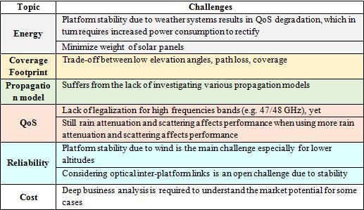 Moreover, for MEO, LEO satellites the signal delay is much less than that of GEOs. Satellites in MEO and LEO orbits are moving around the world to provide global coverage. De-orbiting within their positions, atmospheric drag, solar radiation pressure, and Earth’s gravitational pull, often lead to a shorter satellite lifetime. The atmospheric features such as blockage, fading and shadowing due to the huge distances often raise dynamically-varying characteristics for the satellite channels. Thus, certain considerations like diversity, retransmission, adaptive modulation, link margins, and network coding need to be taken into account to obtain a more reliable channel. Moreover, Rain fade forces satellite systems to drop frequency usage over 30 GHz to the lower frequency of the L and C bands. Whilst higher frequency bands offer access to wider bandwidths, this makes a channel more vulnerable to signal degradation, as radio signals get affected by rain fade [3, 65-70].The higher frequency bands provide access to the wider bandwidths and are vulnerable to signal degradation, as radio signals get absorbed by atmospheric rain, snow or ice (rain fade). Hence, these frequency bands are more suitable for certain geographical regions, such as countries in Africa or Middle-east, which experience less annual rainfall than Europe or East Asia. Relevant research investigates how to utilize these higher frequency bands. The lower frequency bands, on the other hand, are gradually being used up. Satellites are undeniably expensive. From construction to balancing the trade-off between antenna size and signal power to launch into space to maintenance in an environment hostile to sustaining human life, the cost rises exponentially. Often the cost of carrying out major repairs is not cost-effective unlike HAPs [3, 38, 65-70]. Table 3 below summarises the main challenges with satellite communications, as have been discussed above.