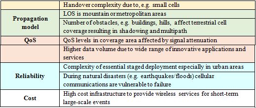 The cellular terrestrial system is a wireless network which divides the geographical area into many cells. Terrestrial links are generally used to provide services in a complex propagation environment [2]. Each cell includes at least a single Base Station (BS) with a frequency that is different from that of its neighbour cells, to avoid interference, as well as offering the best bandwidth within each cell. Antennas within cellular systems usually tend to be Omni-directional or recently smart antenna types, to cover as many reigns as possible. The cellular architecture usually divides metropolitan and countryside zones into parts in accordance with specific wireless service rules. Thus, the performance of the cellular system can be measured by the number of deployment parameters associated with the cell, such as the cell’s size and shape, cell-splitting, as well as the number of users in a cell. This includes the efficiency of frequency reuse, and the handover process [1-3].A study shows that by 2020 the total connected devices that require wireless service will possibly reach 50 billion [9]. In turn, mobile network providers will install more BSs to develop their network’s infrastructure to accommodate more users. Deploying a huge number of BSs to serve mobile users across the world will lead to certain issues that evaluate the network performance of cellular mobile communication systems quite challenging [10]. This section discusses the most common issues that are associated with cellular mobile communication systems: coverage area, data rate and capacity, path loss and shadowing, power consumption, handover process, surveillance and disaster management, and supporting short-term-events.