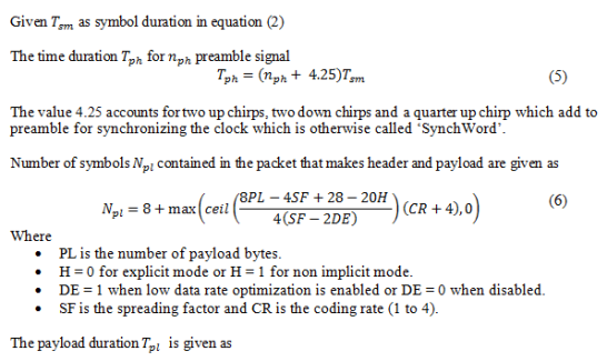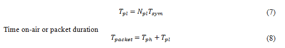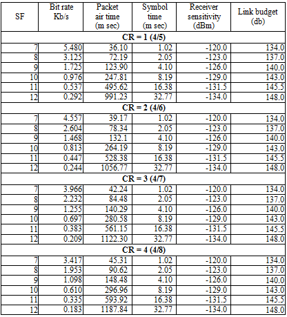 Table 1 shows the theoretical performance of LoRa for different SF for a payload of 8 bytes at 125 kHz bandwidth and centre frequency 868MHz, transmit power of 14 dB in the explicit mode for different CR calculated using equation 8.