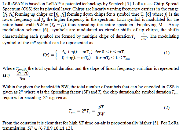 LoRa transmissions are subjected to regulatory and system-level design constraints on time on-air and receiver sensitivity. When transmitted power had a direct relation with receiver sensitivity, time on-air depends on packet formatting. LoRA packet comprises “npreamble” symbols to mark the beginning of a packet, “nheader” symbols as node identifier with CR 4/8 and payload with selected CR. The packet format is shown in figure 3. Uplink messages are transmitted in explicit mode with physical header [10] (PHDR) with optional CRC or implicit mode without header information.The header uses CRC for data integrity and uses CRC4/8 by default. The radio transceiver inserts pay-load and CRC with the physical header. Hence time on air for packet transmission depends on mode selection as explicit or implicit, SF and CR applied for transmission. Downlink messages are sent to the end device through a single gate-way by the network server. These massages use explicit mode with CRC.