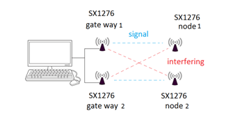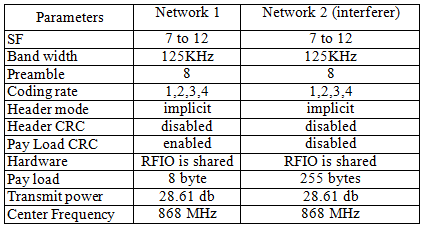 To characterize the behavior of LoRAWAN to Co-SF interferences, we have performed experimentation using LoRa SX1276. The experimental setup uses the LoRa SX1276 end-device per network connected to the SX1276 gateway. Two such networks were set as shown in figure 8.Network 1 uses gateways that are crafted using raspberry-pi, SX1276 hat and the end device (node) using SX1276,Arduino Uno. Data are logged and forwarded using the LoRa packet forwarder[16].Network2 similar to that of network 1sends data with random payload continuously. The two networks were implemented 50 meters in distance to maximize mutual interference and SNR. This also ensures that the threshold level of uplink signals and interfering signals are the same.