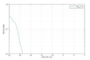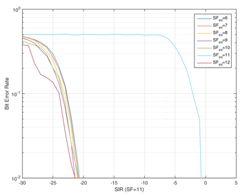 Figures 6 and 7 show overlapping transmissions when SF 12 interfering with SF12 and SF 11. Figure 9 shows bit error performance when simulation repeated with SF 11which is interfered with signals from SF 6 to 12. For all interfering signals except that by SF11, the plot observes superior performance up to -20 dB whereas when SF (SF = 11) interfere, performance degrades form -1 dB. The simulation is performed with packets that are transmitted simultaneously at CR = 3 with interleaving and gray-coding as done in the LoRa physical layer [6]. Overlapping transmissions of reference signals and interfering signals are created by summing reference frames modulated at reference SF with those of interfering signals with interfering SF. Interfering packets are generated until the occurrence of 100 collisions, with a reference payload of 8 bytes.The plot demonstrates the Signal to Interference Ratio (SIR) threshold below which the packets are corrupted. Co- SF interference creates a low threshold level of SIR below which packet recovery is difficult due to high BER. Simulation confirms that Co-SF interference creates high BER leading to packet loss.