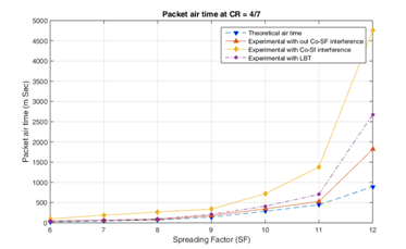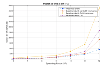 At lower CR especially at 1, 2 packet errors are significantly high in the presence of interference, while packet air time is lower. Whereas at CR = 3 and 4, though lower packet error is observed, the packet on air time is significantly high. This is because at Hamming code 4/7 and 4/8 error correction properties are superior to that of 4/5 and 4/6. 4/5 CRC is a simple parity check. If the packet is lost due to interference or any other reason, the gateway request for re-transmission during the acknowledgment cycle. This justifies the increase in packet air time as observed in the plot. The possibility of packet error to happen at higher CR is that the packet is totally lost or decoded erratically to match with CRC or the acknowledgment cycle is decoded erratically.