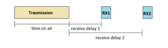 The evaluation performed in this paper uses Class A device as a node for its power-saving feature. After every packet transmission, the end device waits for one of two receive slots which happen in a fixed interval, taking the end of transmission as reference. Figure 4 demonstrates Class A transmission. The RX1 slot uses frequency and data rate as a function of the uplink. RX1 is opened for receive delay 1 second with a tolerance of after the end of packet transmission. The delay and data rate are determined by specifications applicable to the region of operation. The second slot RX2 uses configurable fixed data rate and frequency.