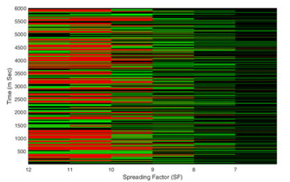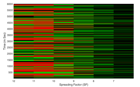 The first case can be dismissed as signals of different SFs are quasi-orthogonal. Quasi-orthogonal signals cancel upon multiplication with a down chirp. Packet loss can happen only if the noise level is beyond the threshold and can hold very much for low SFs. On the contrary spectrogram in Figure 5 reveals thatcollisions are higher at higher SFs especially at 12 and 11. The situation narrowed down to signals of the same SF interfering. Let us call this situation as Co-Spreading factor (Co-SF) interference where packets with the same SF interfere.