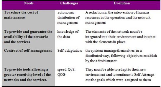 The gasoline of the networks autonomic (component system + component network) is the Self- communication which enables him to make the adoption of the services and the resources and what they offer according to the evolution of the user’s needs, the conditions of the environment and the objectives of a business.