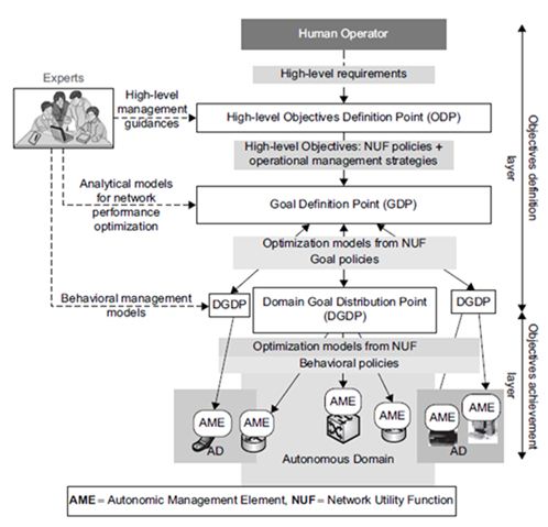 The autonomic networks are considered as a solution for the concept of management autonomous the policies make it possible to guide the autonomous elements in terms of objectives to be reached, or service to be returned, load with this one to adapt to the dynamic modification of the rules of policy. To avoid the intervention of the human administrators, the autonomous networks have an automatic characteristic of reflection through well-defined techniques of training but the problems of safety of network (confidence of information, defense, tackles protocols of routing, the dynamic confidence of self-management…) remain stakes [12]. The management of future internet requires the adaptation of autonomous networks to intelligent strategies that provide the technical support for the construction of temporary and highly dynamic networks to meet the human needs for the future ubiquitous and flexible network [13-17]. The key components are policy-based management and intelligent systems as well as the organization of individuals who are the key actors to make Internet management work. It depends on better computation and advanced technology such as the SDN technology, which will be technological pilots for autonomous systems.