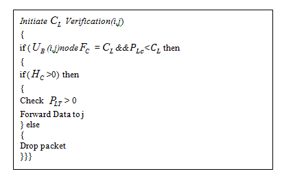 Algorithm 1 (pseudo code) shows how confidence assessment is done. Initially, packet forwarding count and packet loss count are checked with CL. If it is less than CL, then two more conditions are checked such as hop count and packet life count. If these are greater than zero the packet will be sent to next node j, otherwise, packet will be deleted.
