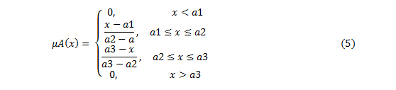 Fuzzy logic is composed of if-then rules. The if-part of the rule is called the originator while thenpart is called the consequential. A fuzzy logic system maps crisps inputs to crisp outputs. There are four mechanisms in a fuzzy logic system, namely rules, fuzzifier, inference mechanism, and defuzzifier as shown in Figure 3. Rules are fundamentally if-then rules which must be evaluated during an input/output process. The output of the system depends on these rules. Fuzzifier is responsible to take crisp numbers as input and give fuzzy sets as output. The beginning of rules is dependent on the output of the fuzzifier. The Inference mechanism in the fuzzy logic system is the decision making part. Defuzzifier maps the fuzzy output of the inference mechanism into crisp numbers to make it function for further processing by the system [18]. A triangular fuzzy number is chosen for better results and can be defined by a triplet (a1, a2, a3). The membership function is shown in equation 5